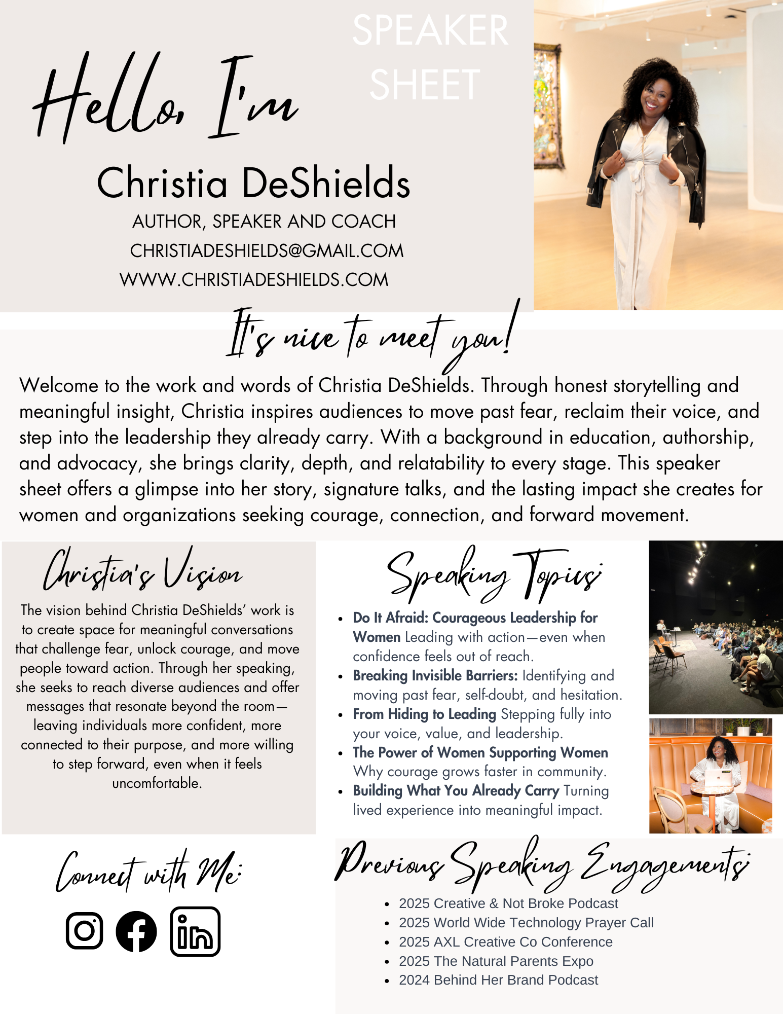 I’d love to partner with you to inspire, encourage, and equip your audience. Whether it’s a conference, workshop, retreat, or creative event, my goal is to bring practical tools, authentic stories, and faith-centered encouragement that leave your attendees motivated and empowered.